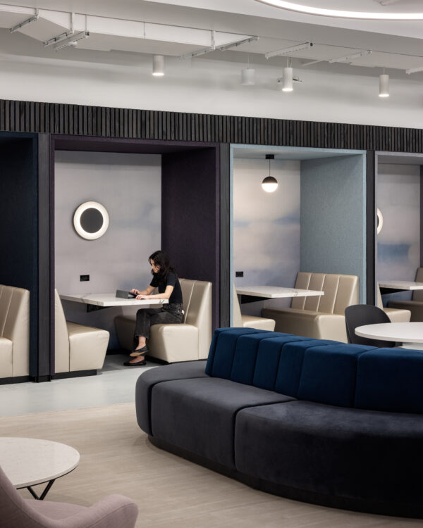 Empire’s custom millwork and furniture provider, Fabricate, played a key role in translating the company’s brand and culture into the space. They expertly crafted bespoke pieces that off-the-shelf furniture couldn’t achieve. This custom package includes banquettes, lockers, bookcases, tables, credenzas, stadium seating, the stone reception desk, and much more.