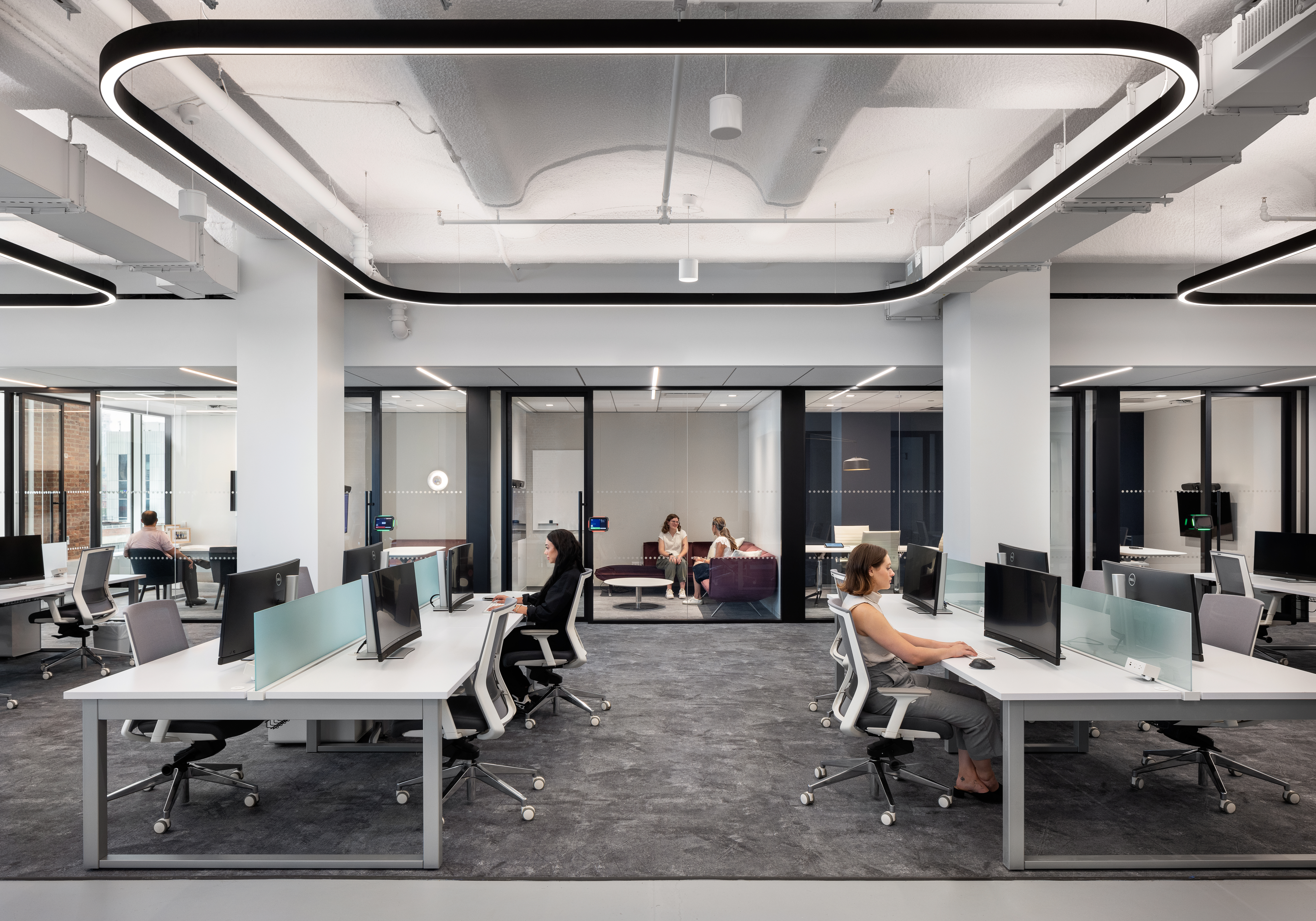 Empire sourced furniture from over 30 manufacturers, including Arper, Viccarbe, Stylex, Davis, Bernhardt, Wilkhahn, and Gubi. The workspace features AIS Oxygen benching, which complements the open, collaborative nature of the office and supports employees’ evolving workstyles.